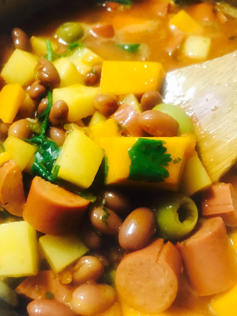 - In with the tomato sauce. Mix, mix, mix. Add your cumin and oregano. Mix. In go the beans. Mix. Add pumpkin, sausage, potato, cilantro, mix.