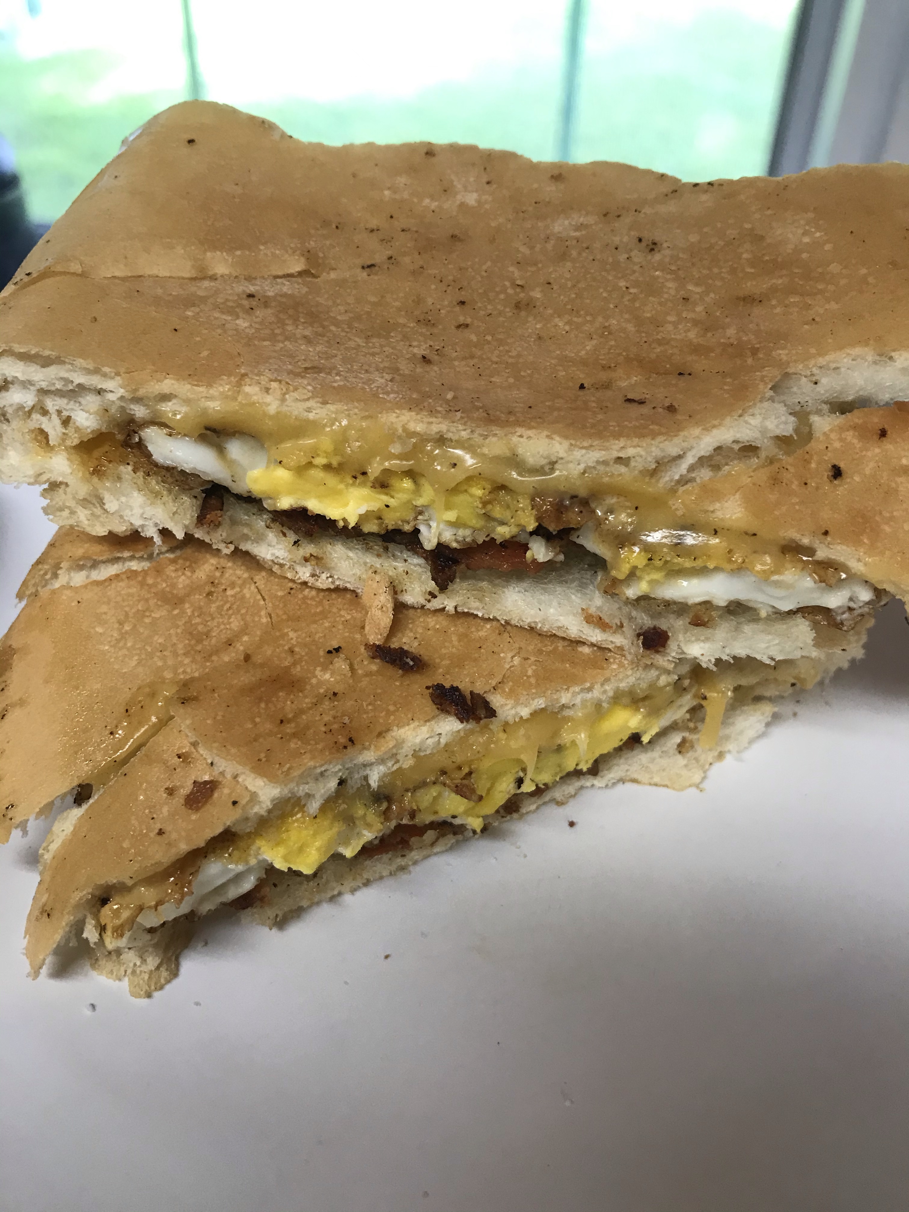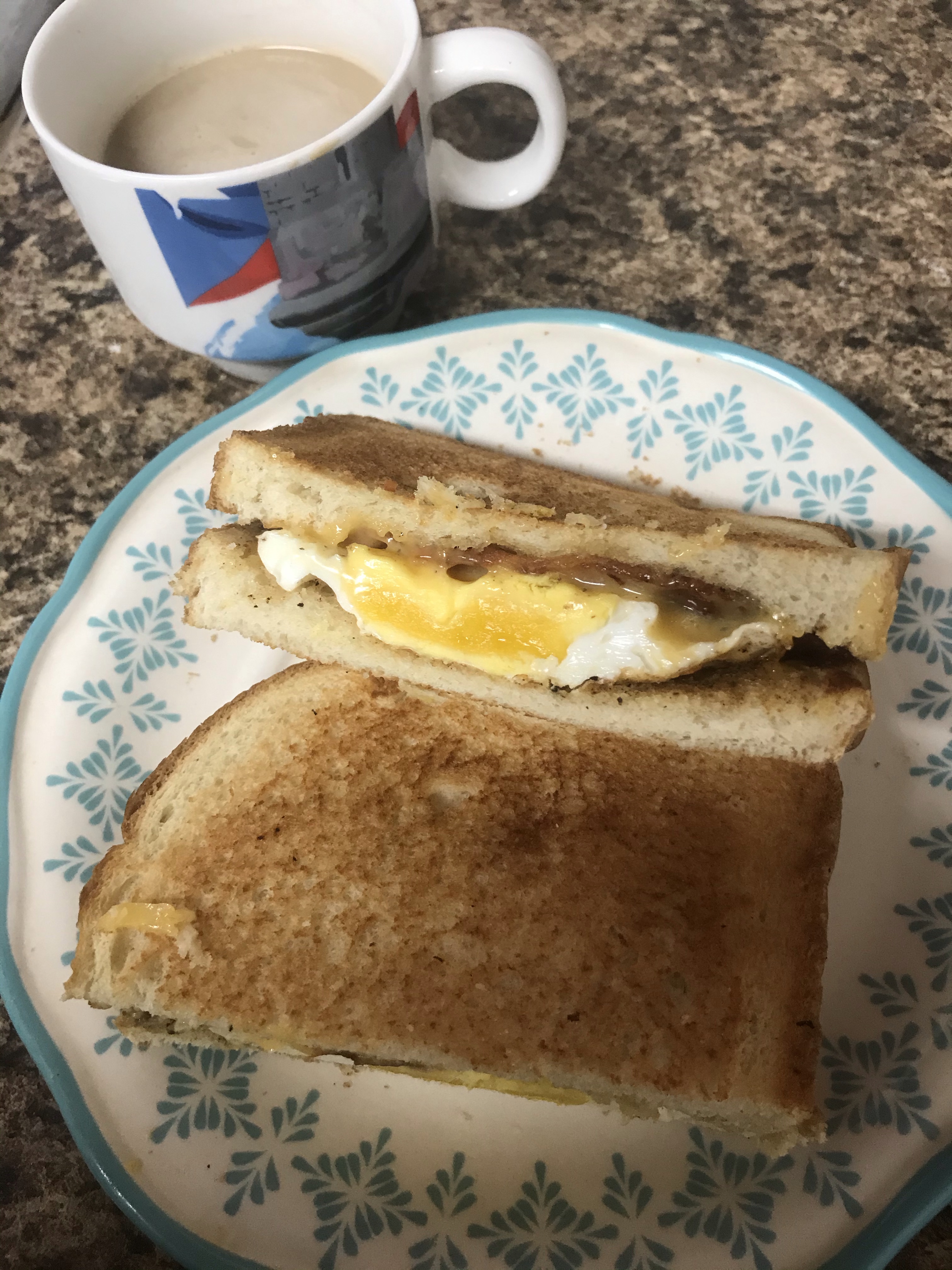 - If you are using your skillet to toast your bread follow this step. When one side of your bread is toasted add cheese to toasted side, add your bacon , egg and toast till golden brown.